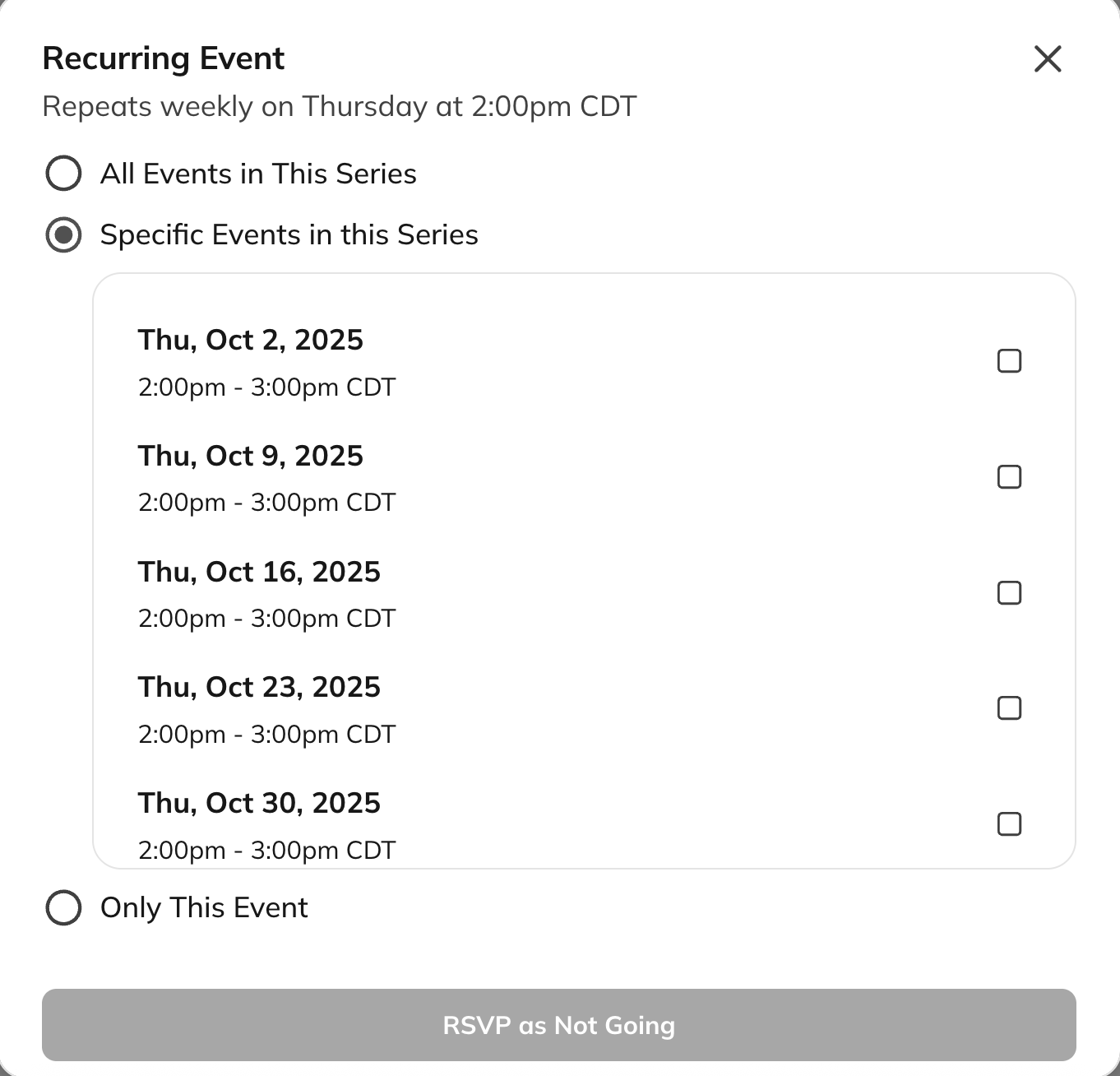 Members can RSVP directly from the top of the Event. They’ll see that it’s a Repeat Event and can view the full list of upcoming Events in the series at the bottom of the page. They can click through to open all Events in the calendar view. When responding with Going, Maybe, or Not Going, members can RSVP to:- All Events in the series, or