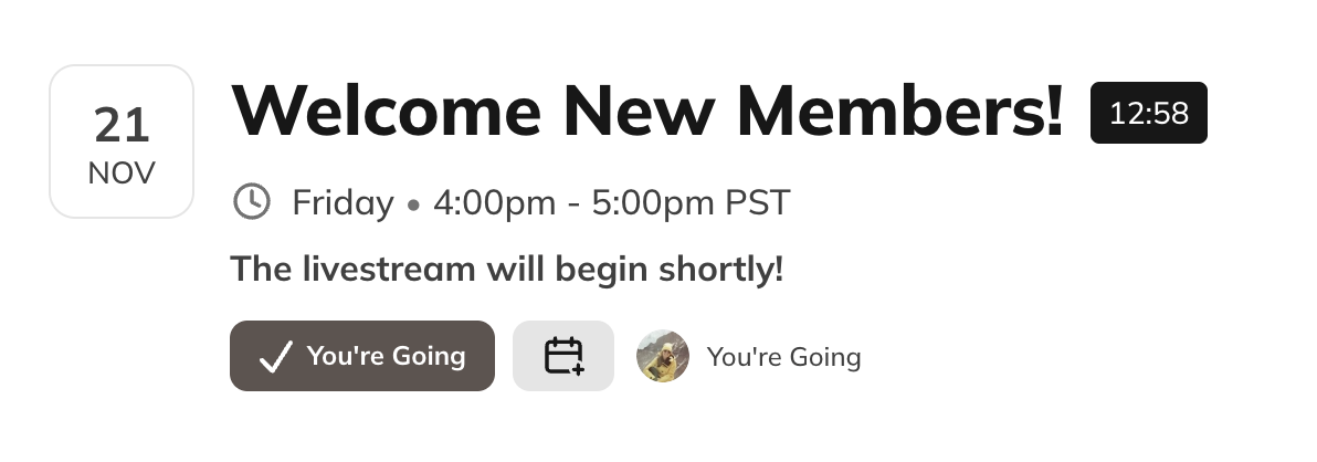 Members will see a message on the Event “The livestream will begin shortly!”. After you start the livestream, they will see **“Join the Livestream”**which will take them directly to the live video.