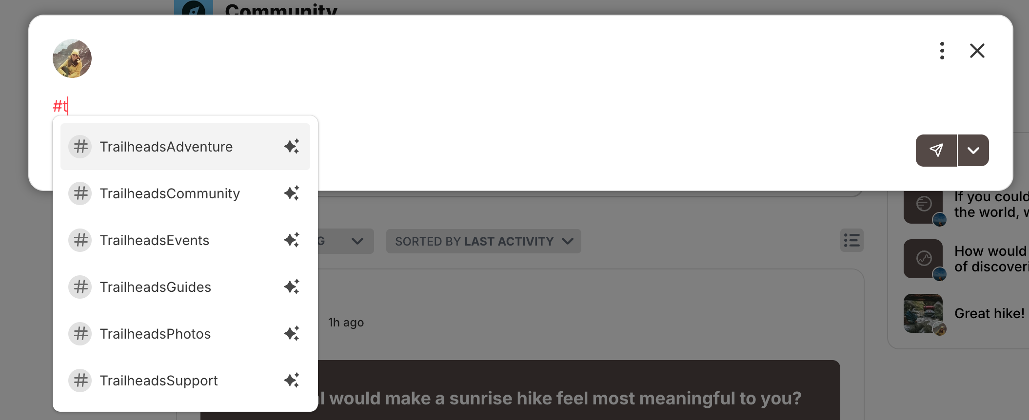 When creating Posts, Articles, or comments on web (and on iOS or Android for Posts), you’ll see a prompt to add a hashtag. Click the prompt to insert a # where your cursor is. As you type, a dropdown will appear showing hashtags— including any highlighted hashtags in that Space.